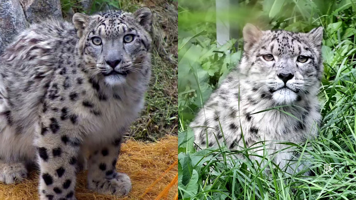 雪豹“凌小蛰”和“凌小芒”近照,它们被亲切地称作“蛰么芒”。(拼版照片)